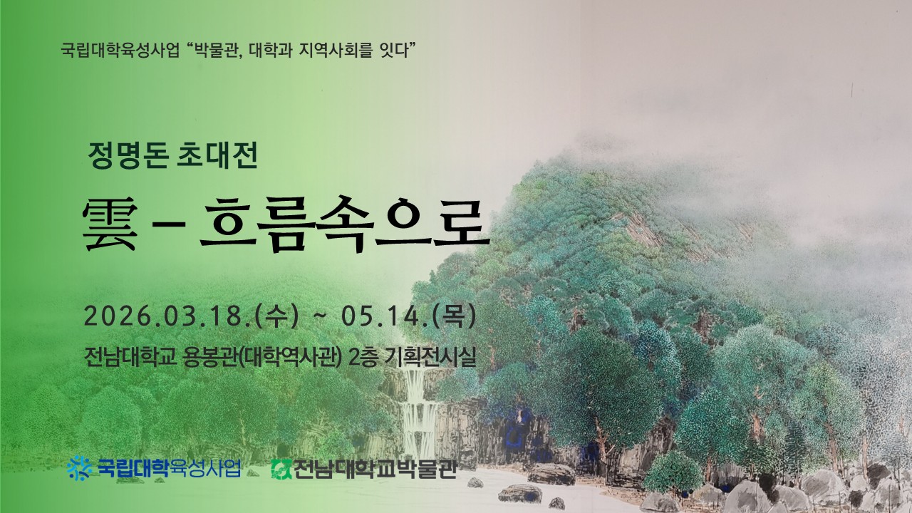 전남대학교박물관은 용봉관(대학역사관) 2층 기획전시실에서 정명돈 초대전 <雲-흐름속으로>를 개최합니다.